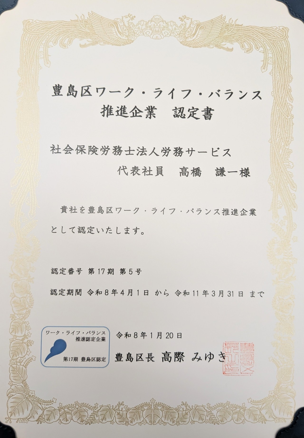 1月20日に当事務所は「豊島区ワークライフバランス推進認定企業」に選定され、高際区長より直接表彰状を拝受いたしました。区長からは「区内の推進役を担うリーディングカンパニーに」との温かい激励をいただき、所員一同身の引き締まる思いです。