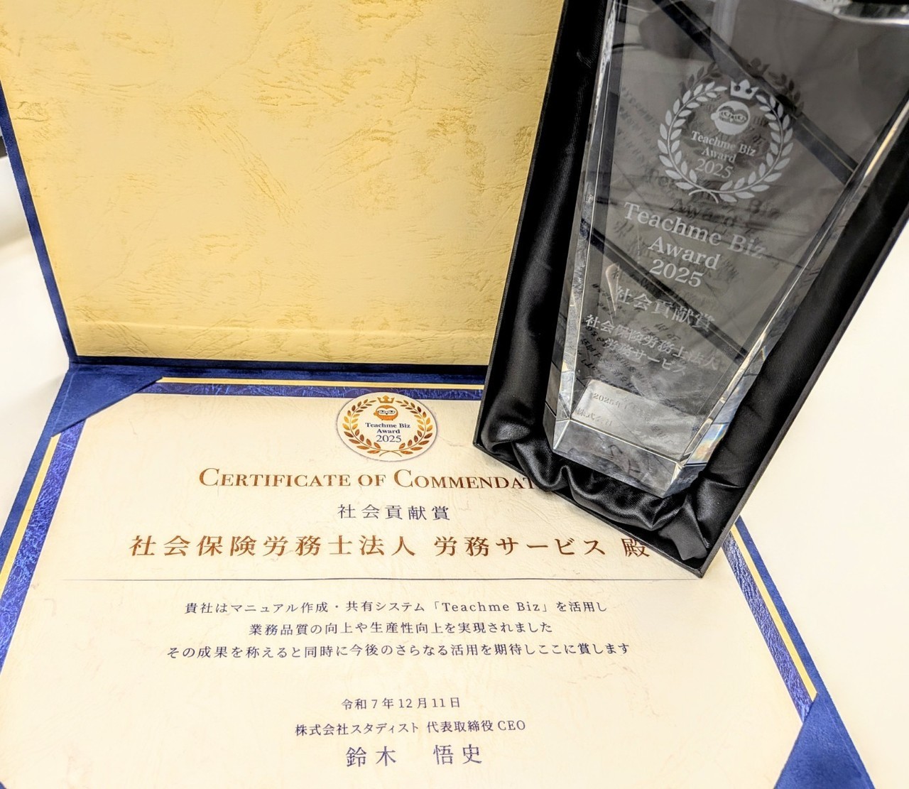 12月11日にマニュアル作成システム売上シェアNo1のTeachme Bizより利用者2000社の中から弊所が2025年の「社会貢献賞」に選ばれました。